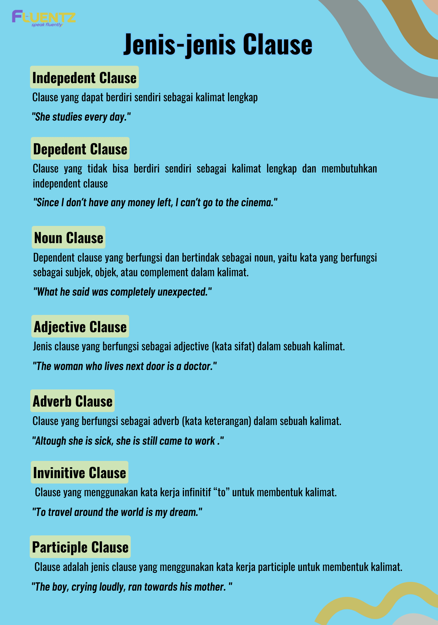 Namun, dependent terbagi lagi menjadi beberapa jenis, so kamu akan menemukan 7 jenis di artikel ini. Yuk kita bahas satu persatu tentang jenis dan contoh clause.