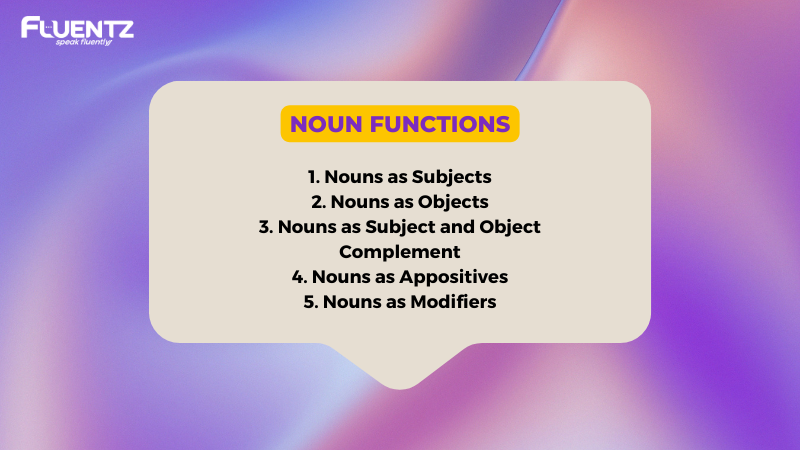 Setiap kata benda dalam kalimat tentu memiliki fungsi yang berbeda-beda tergantung pada konteks kalimat yang digunakan. Berikut ini adalah penjelasan dari fungsi-fungsi nouns.