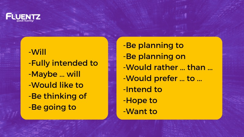 Umumnya, untuk mengungkapkan niat atau expressing intention kamu bisa menggunakan simple future tense. Terdapat beberapa ungkapan dari expressing intention yang bisa kamu gunakan dalam sebuah kalimat, yaitu sebagai berikut: