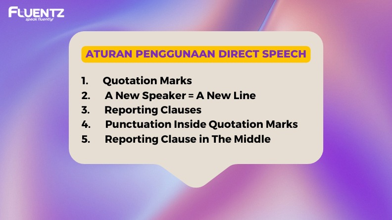 Terdapat beberapa aturan yang harus diikuti ketika menulis direct speech. Hal ini dikarenakan agar penulisanmu dalam bahasa Inggris tepat dan efektif. Berikut ini adalah aturan-aturan direct speech dan contoh penggunaannya: