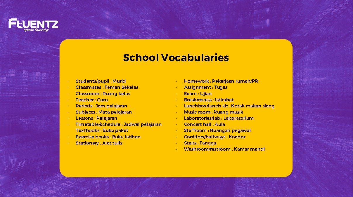 Agar lebih mudah mempraktekkan percakapan bahasa Inggris di sekolah, kamu bisa melihat contoh-contoh percakapan dan dialog pada artikel ini. Tapi sebelumnya, terdapat beberapa kosakata atau vocabulary dalam lingkungan sekolah yang sering digunakan.