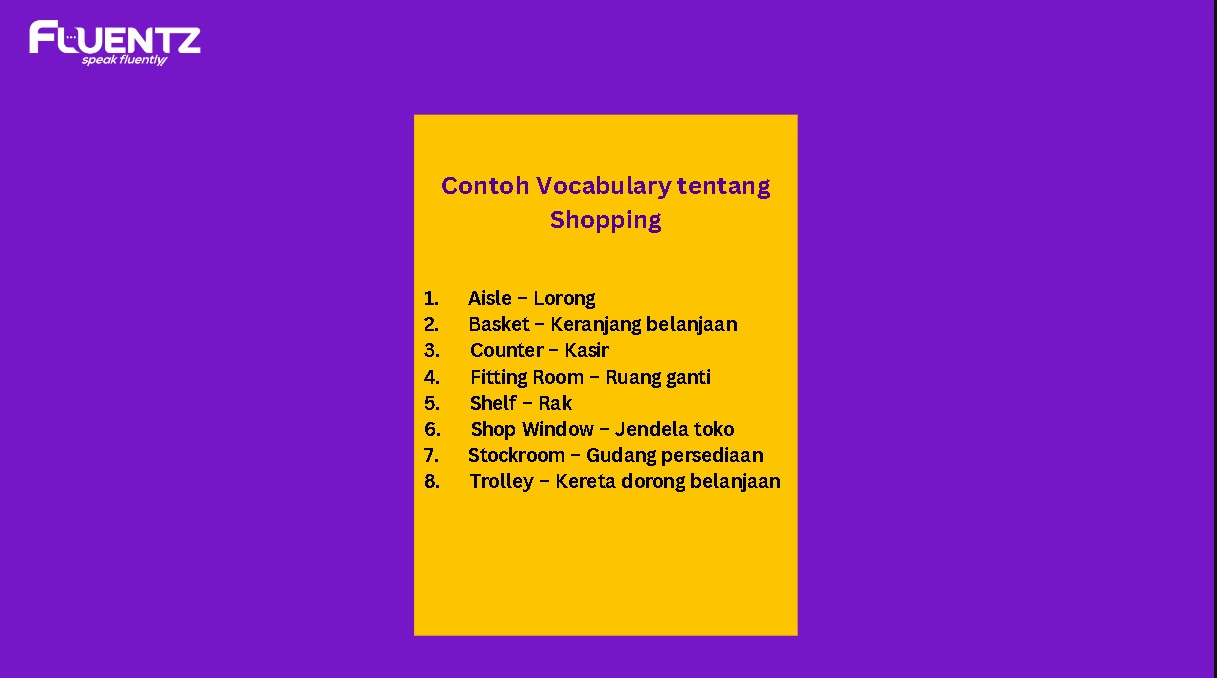 Tentunya ada banyak sekali vocabulary mengenai shopping yang akan membantumu jika kamu sedang berbelanja di negara berbahasa Inggris. Berikut adalah contoh dari vocabulary mengenai shopping: