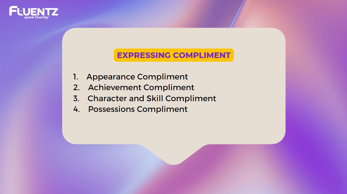 Compliment atau pujian yang kamu berikan bisa berupa pujian atas penampilan, prestasi, karakter, atau hal-hal positif lainnya yang kamu sadari pada lawan bicara atau orang lain.